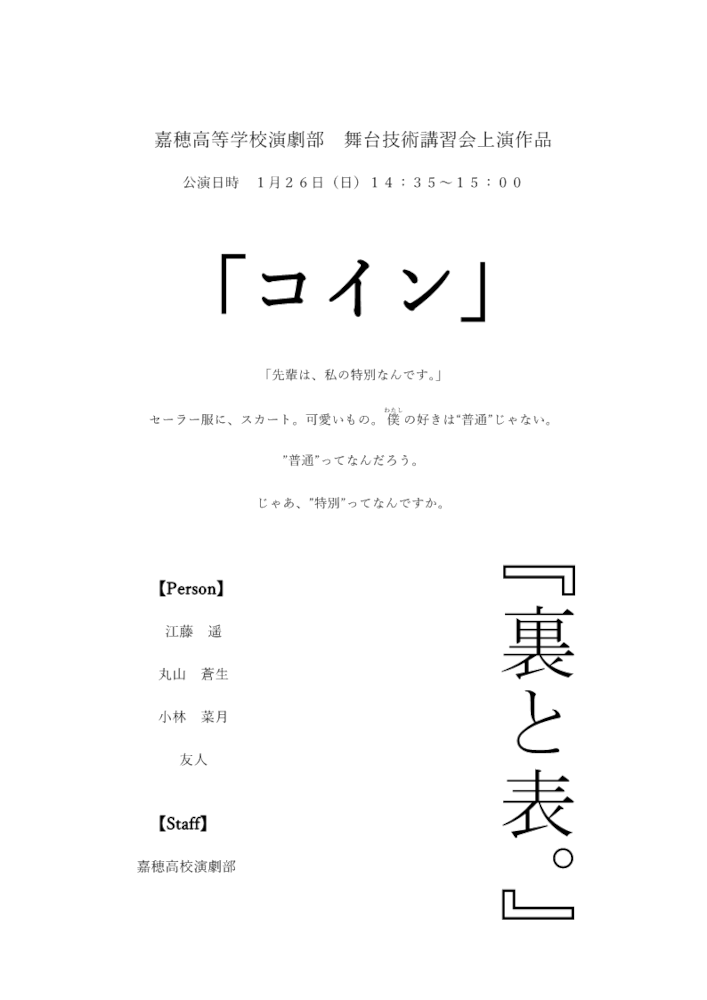 嘉穂高校演劇部は今週末1/26(日)に春日市ふれあい文化センター(スプリングホール)で行われる舞台技術講習会に出演予定です。